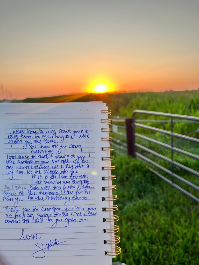 As the sun hits my face, my cup is filled. My heart warms as the sky lights up with bright colors. I thank the Lord that I get to sit here in a corn field and just listen to the sounds of God’s creation.